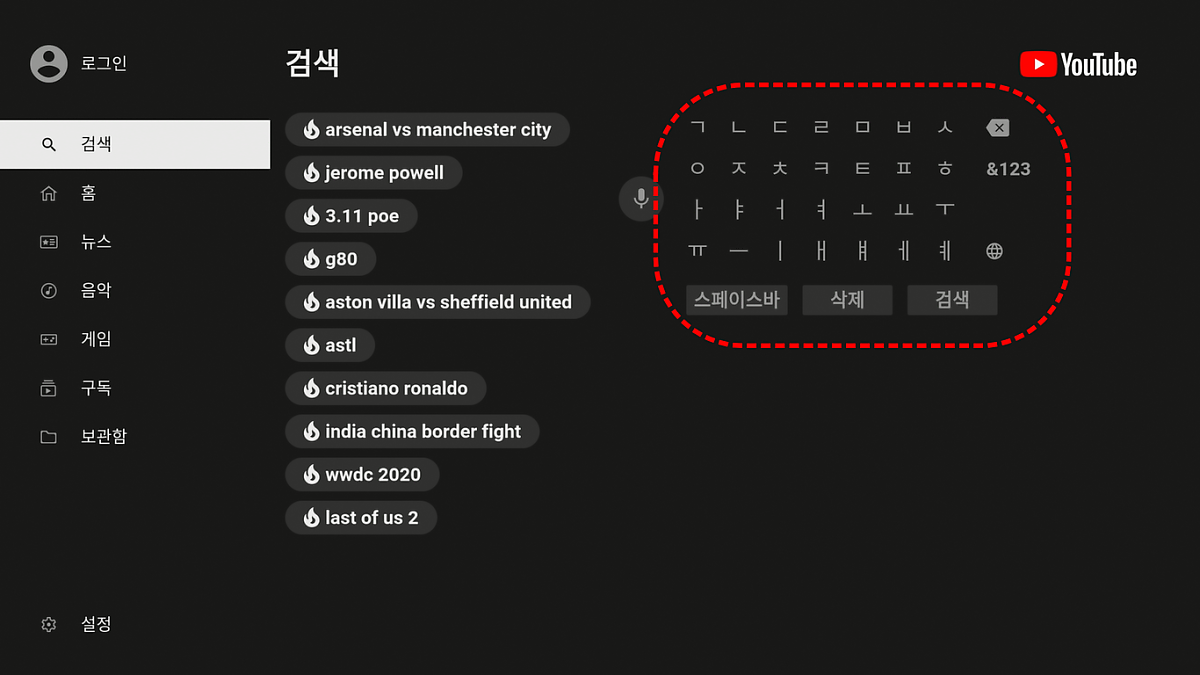 3. 리모컨의 오른쪽 방향키를 눌러 키패트로 이동하여 검색어를 입력한 뒤, 검색으로 이동 후 OK 버튼을 누릅니다.