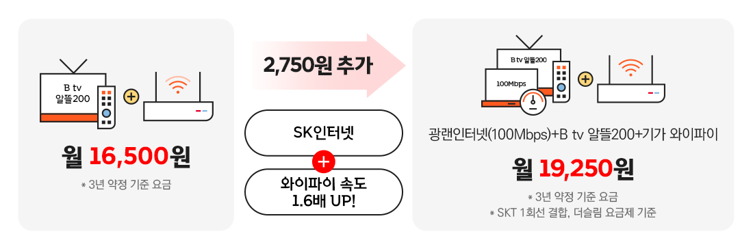 여기서 월 2,750원만 더 추가하면 SK 인터넷 선을 사용해 와이파이 속도가 1.6배 빨라진답니다.