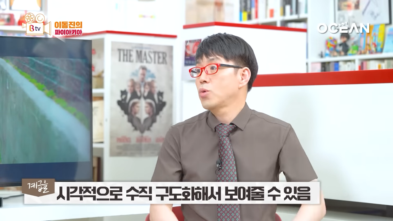 이동진 평론가는 봉준호 감독의 <기생충>을 미장센의 또 다른 예시로 설명합니다.