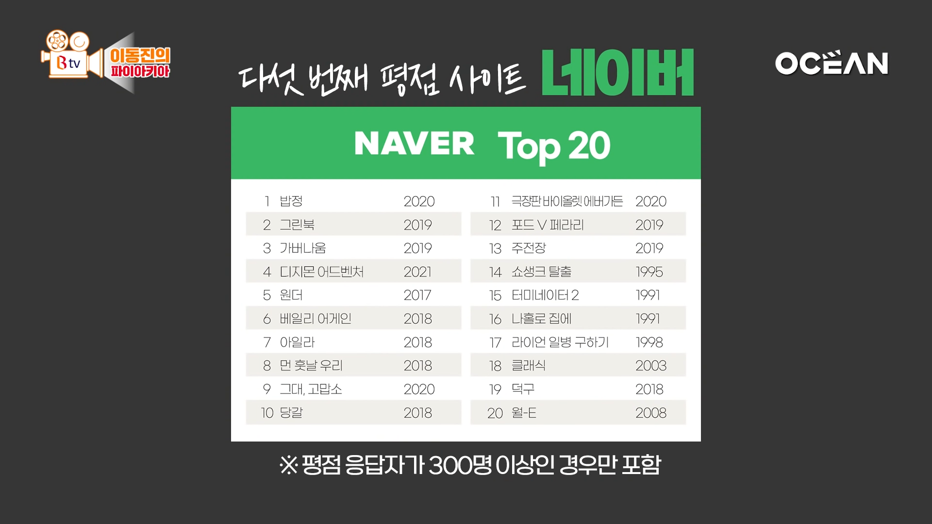 ‘B tv 이동진의 파이아키아에서는 국내외 대표적인 영화 평점 사이트에서 최고의 평점을 받은 Top 20의 작품들을 선정해보았는데요.