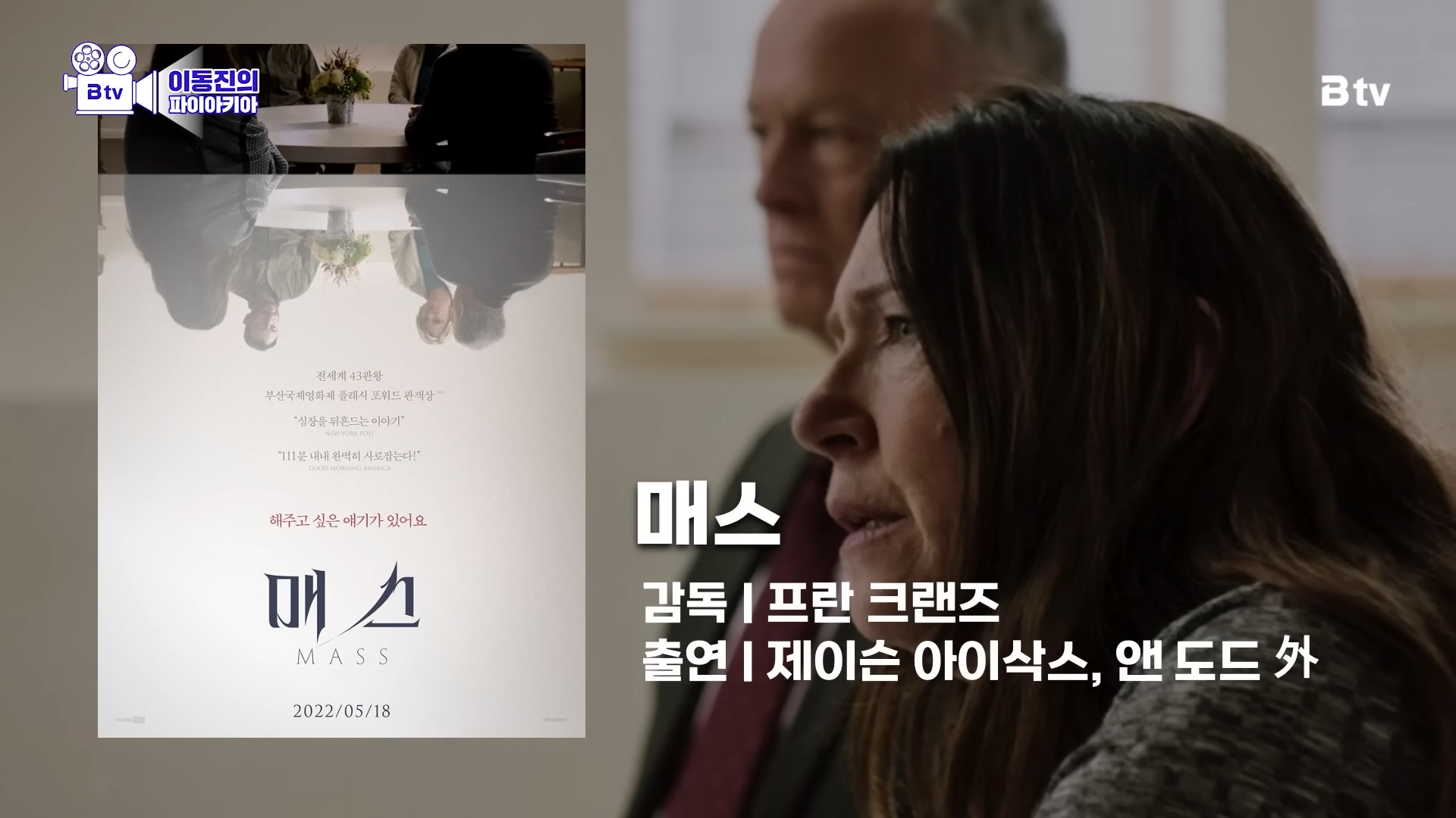 이동진 평론가는 <매스>가 연기와 연출이 모두 훌륭한 심리 드라마라고 말하며