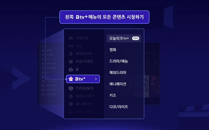 리모컨의 '홈' 버튼을 누르면 나오는 B tv 홈에서도 B tv+ 전용관으로 이동할 수 있답니다.