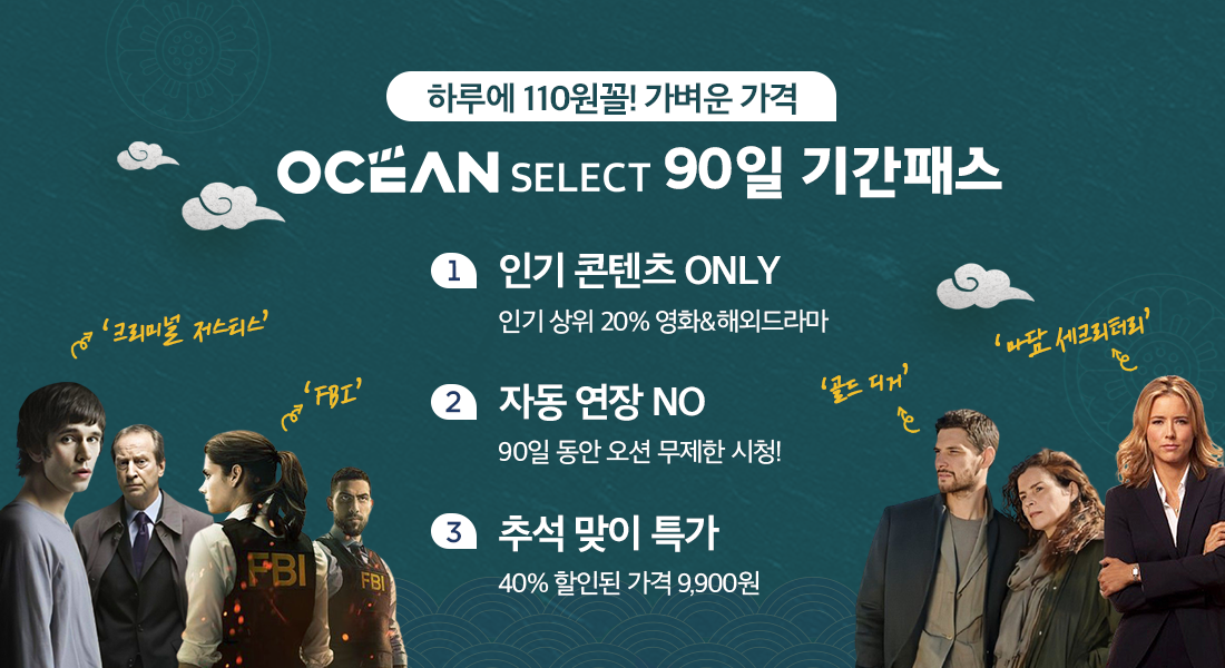 하루 110원 꼴의 가벼운 가격에, OCEAN 인기 상위 20% 영화와 해외 드라마를 보실 수 있어요.