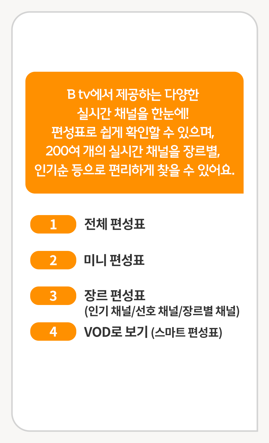 B tv에서 제공하는 다양한 실시간 채널을 한눈에 편성표로 쉽게 확인할 수 있으며,