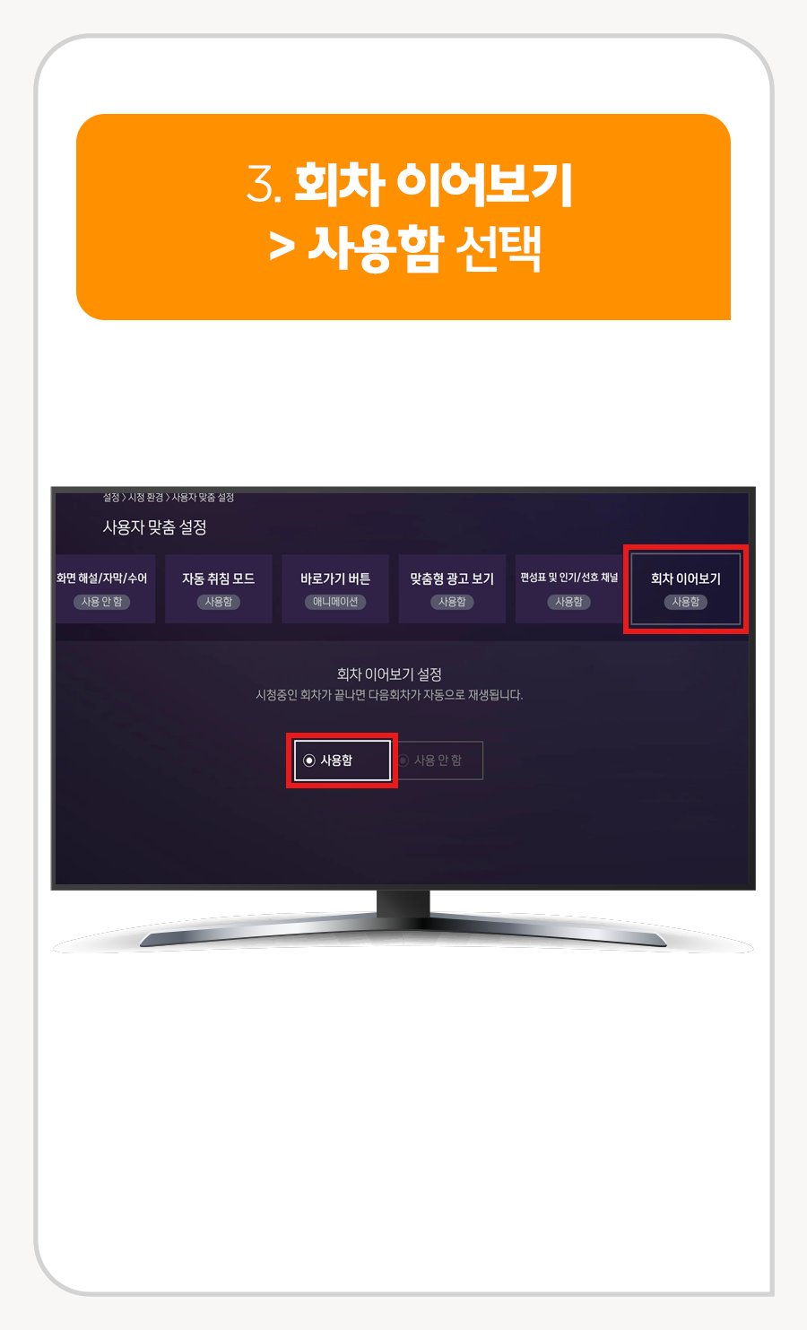 B tv 홈 ▶ MY ▶ 설정 ▶ 사용자 맞춤 설정 ▶ 회차 이어보기