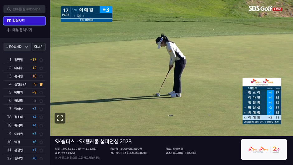 언제 어디서나 골프 경기를 시청할 수 있는 B tv AI 골프!