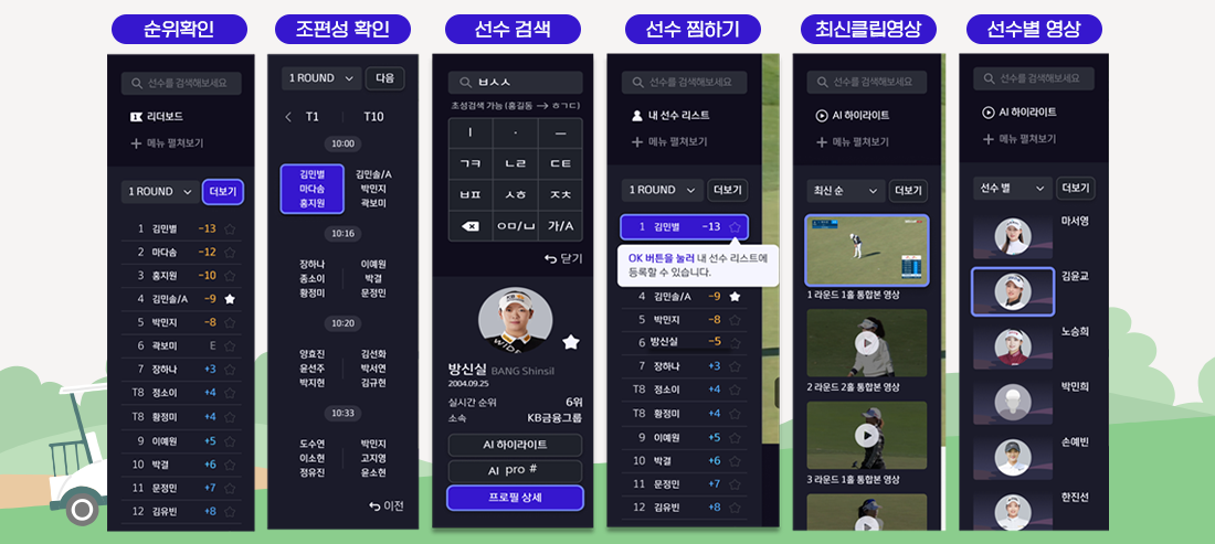 KLPGA와 KPGA 경기 생중계를 더 풍성하게 즐길 수 있는 서비스 입니다.