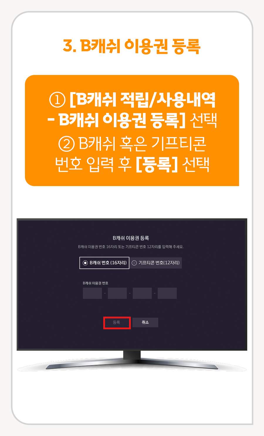 ② B캐쉬 혹은 기프티콘 번호 입력 후 [등록] 선택