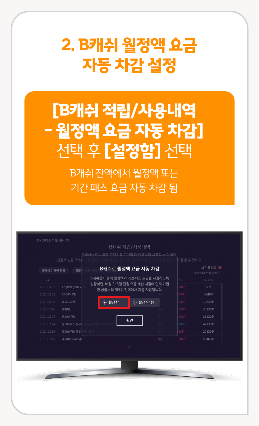 - [B캐쉬 적립/사용내역] ▶ [월정액 요금 자동 차감] 선택 후 [설정함] 선택