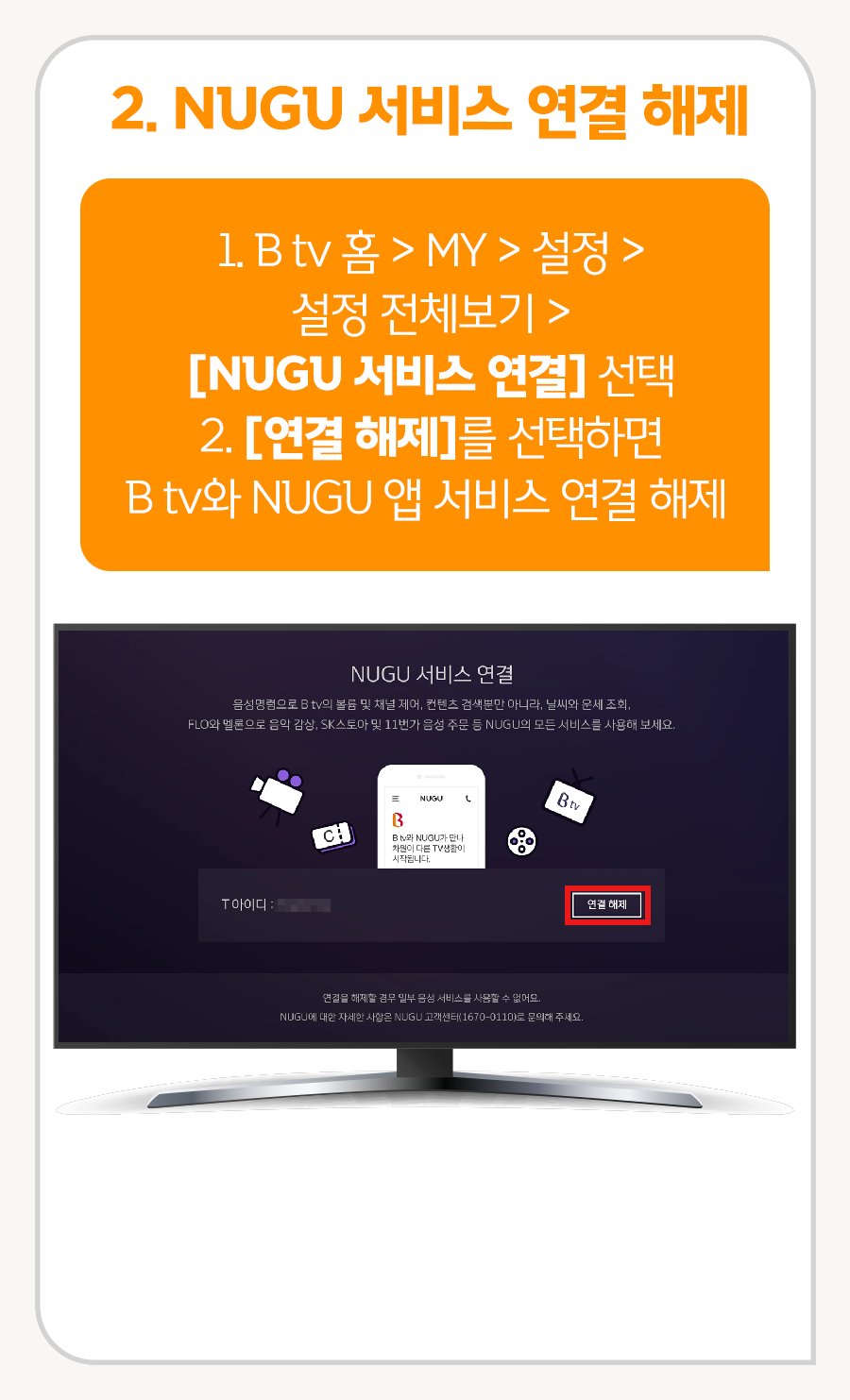 2. [연결 해제]를 선택하면 B tv와 NUGU 앱 서비스 연결 해제