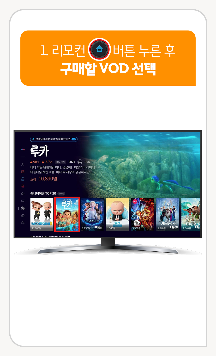 1. 리모컨 홈 버튼 누른 후 구매할 VOD 선택