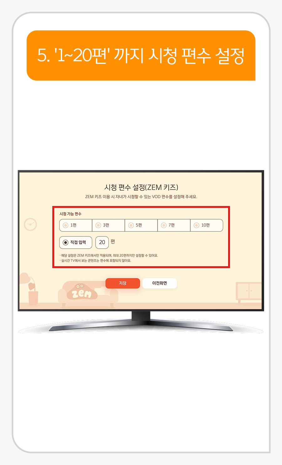 자녀가 하루 동안 TV를 시청할 수 있는 시간, 시간대 및 편수 설정할 수 있어요!