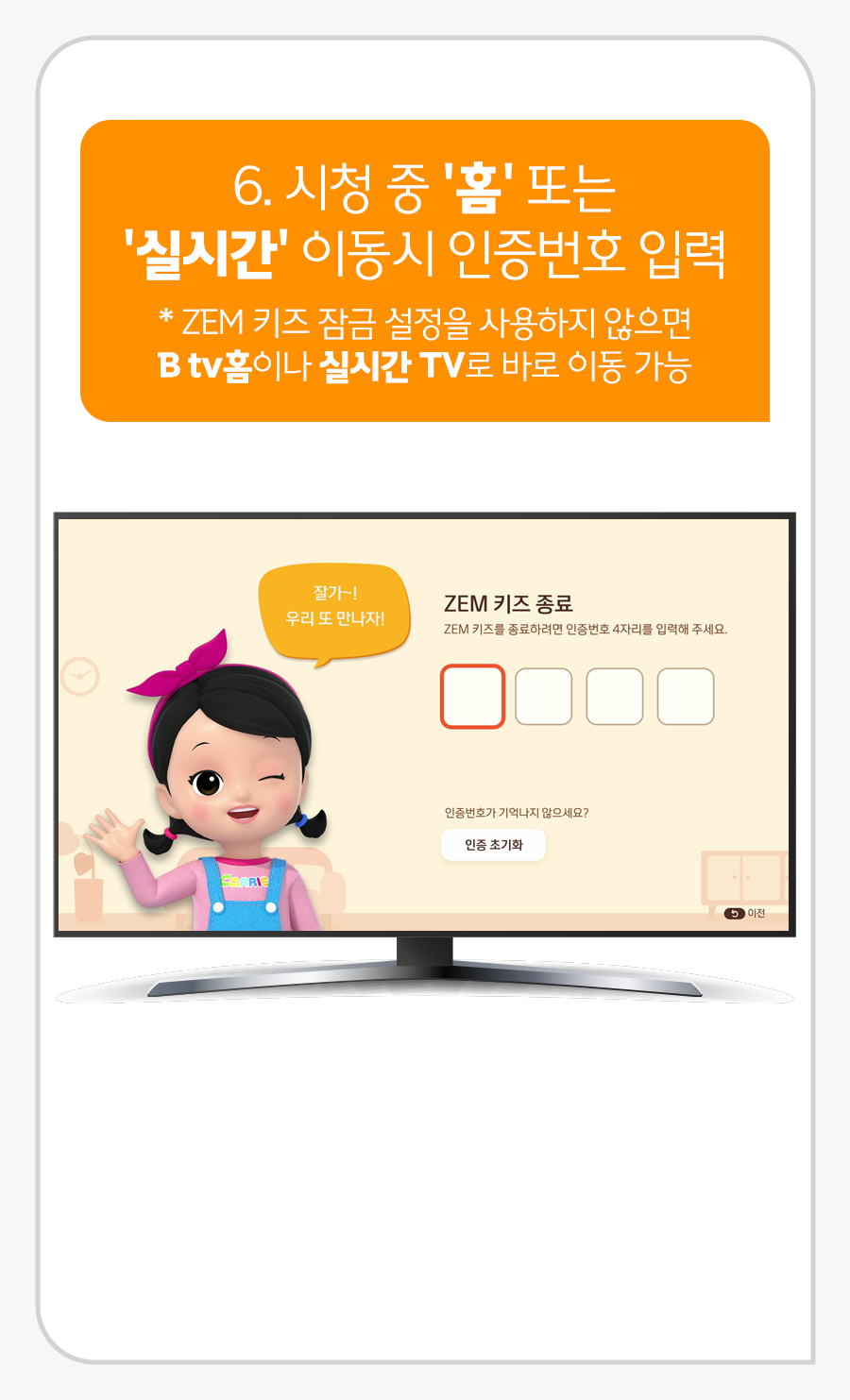 6. 시청 중 '홈' 또는 '실시간' 이동 시 인증번호 입력
