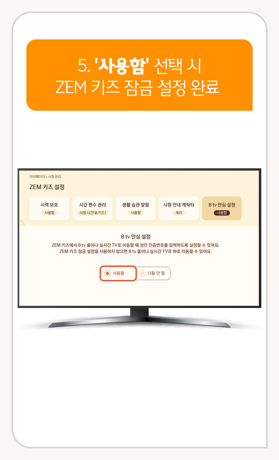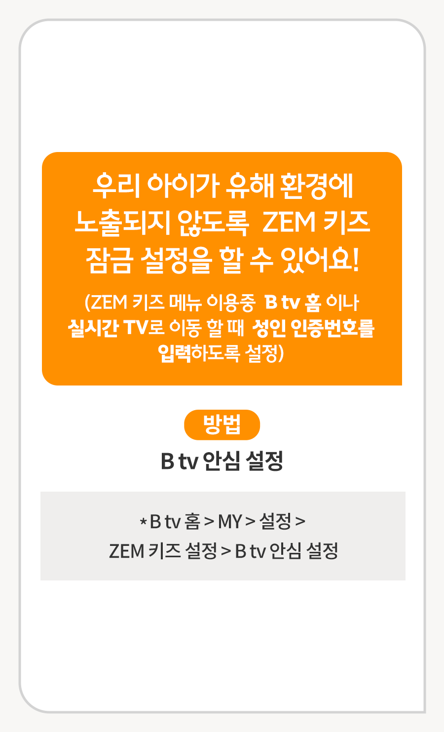 B tv 홈 ▶ MY ▶ 설정 ▶ ZEM 설정 ▶ B tv 안심 설정