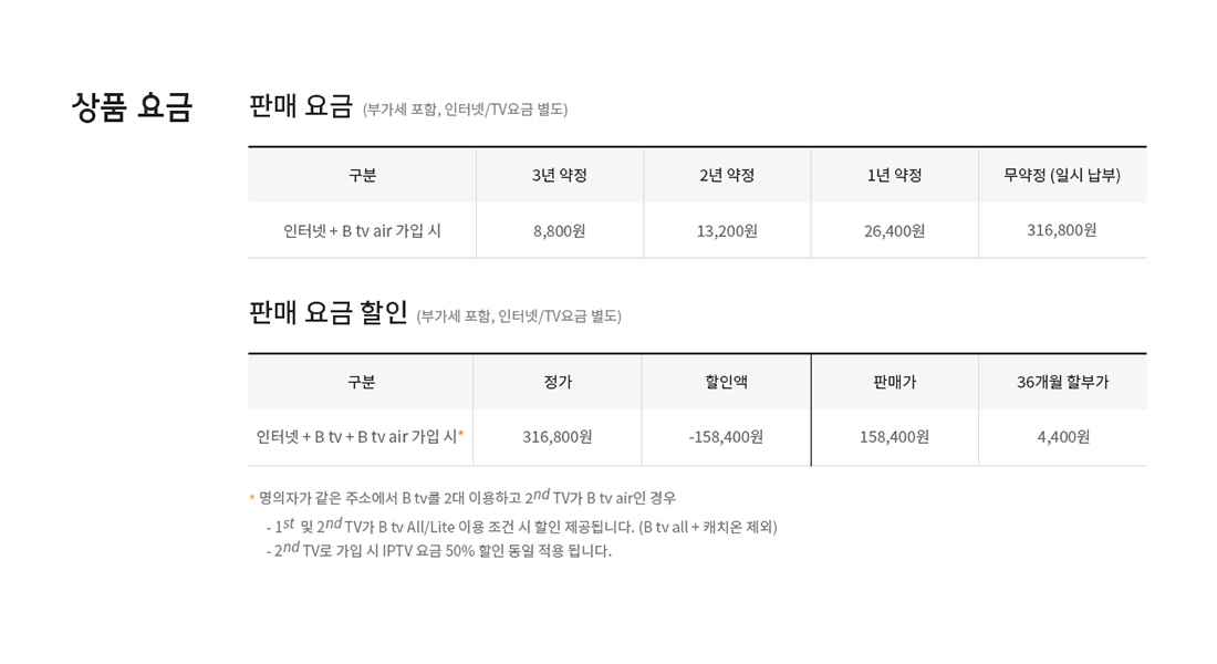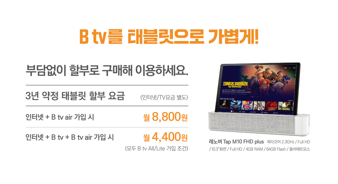 3년 약정 태블릿 할부 요금 기준, ‘인터넷 + B tv air’ 가입 시 월 8,800원, ‘인터넷 + B tv + B tv air’ 가입 시 월 4,400원으로 부담 없이 이용해볼 수 있어요.