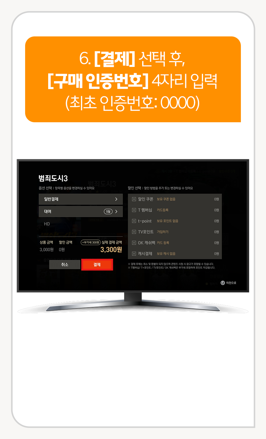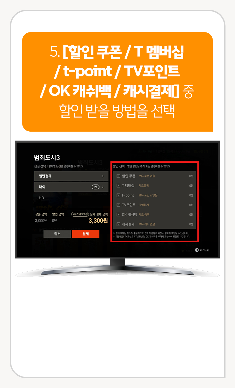 5. [할인 쿠폰/ T 멤버십/ t-point/ TV포인트/ OK 캐쉬백/ 캐시결제] 중 할인 받을 방법 선택