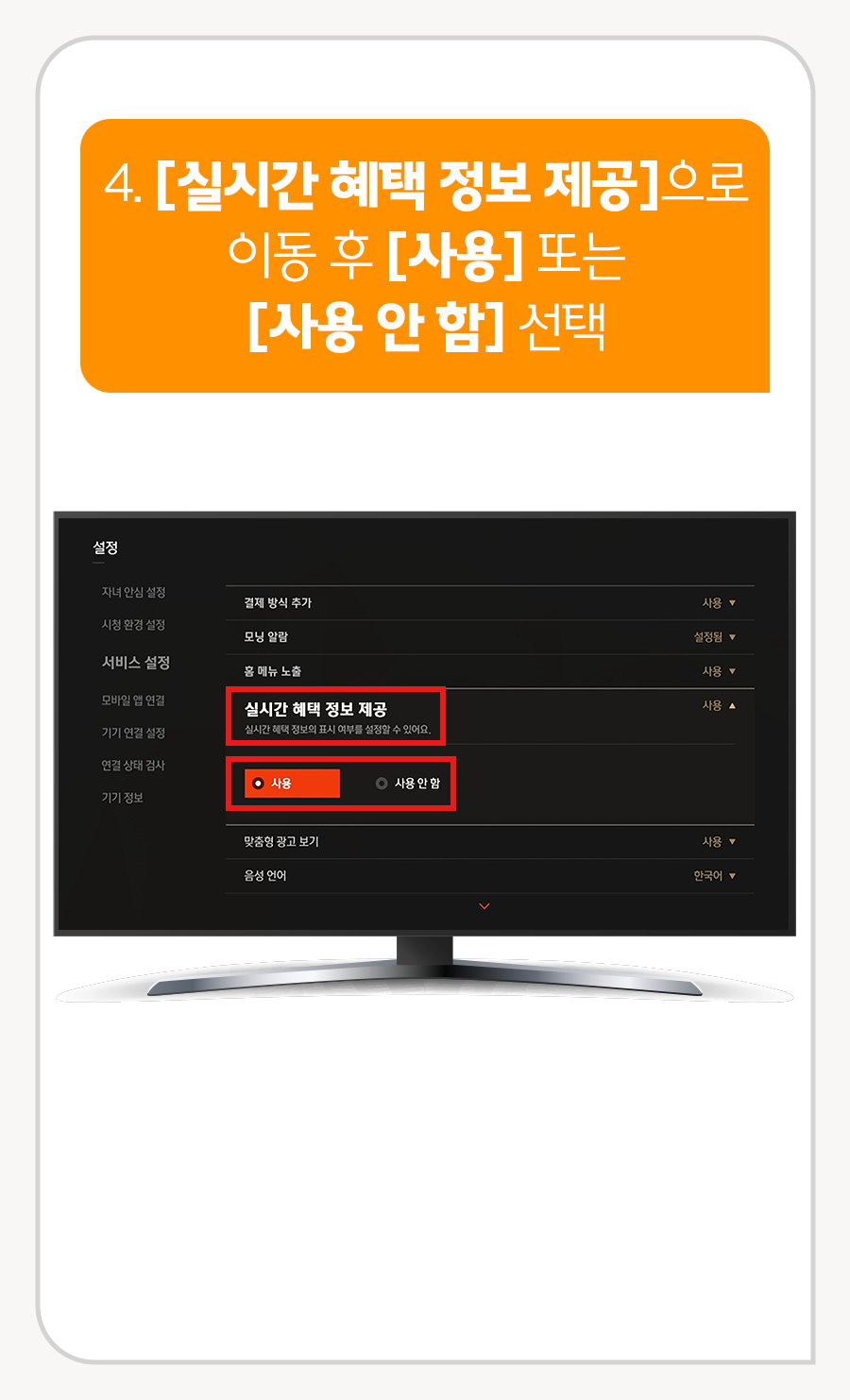 4. [실시간 혜택 정보 제공]으로 이동 후 [사용] 또는 [사용 안 함] 선택