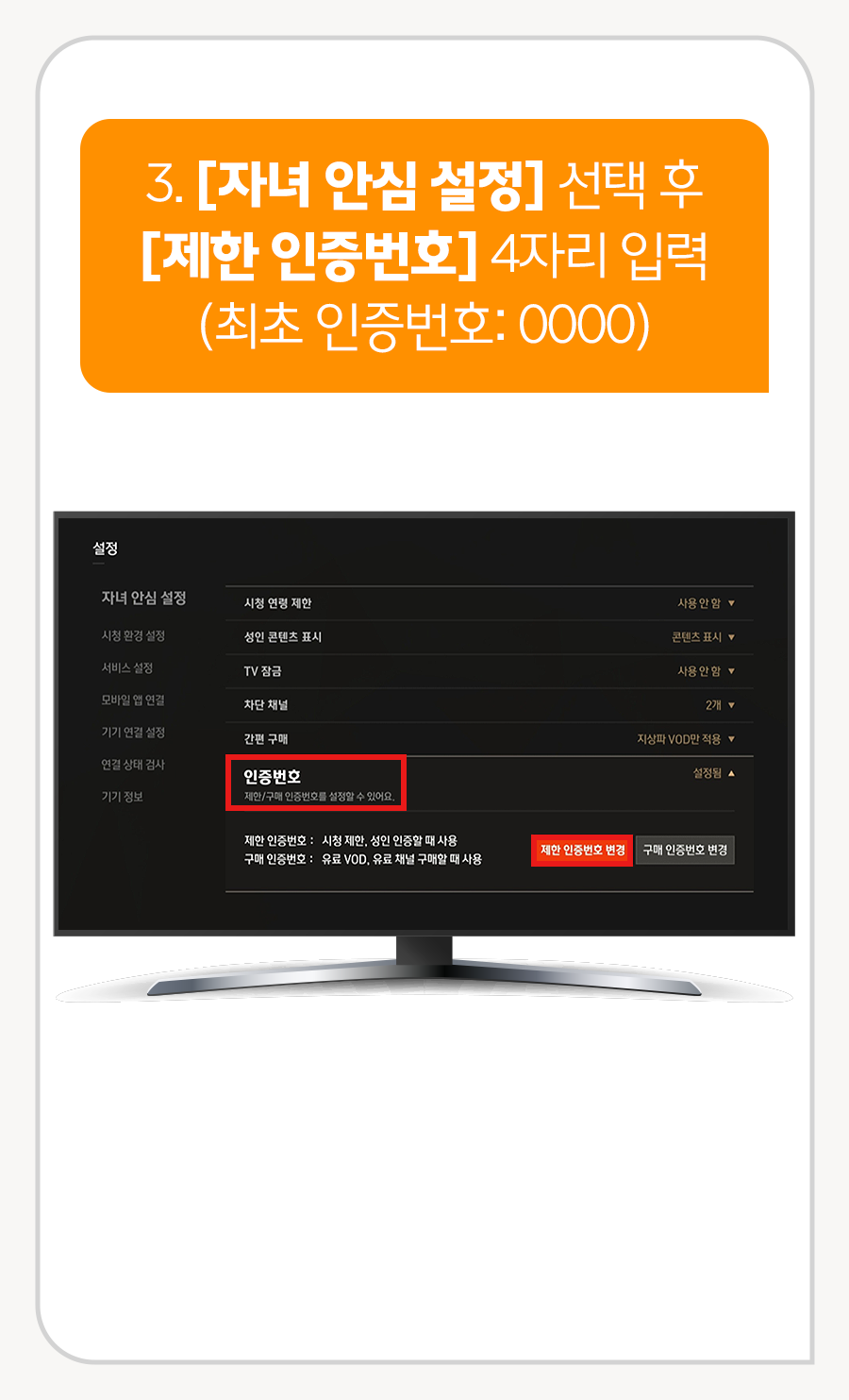 3. [자녀 안심 설정] 선택 후 [제한 인증번호] 4자리 입력 (최초 인증번호: 0000)