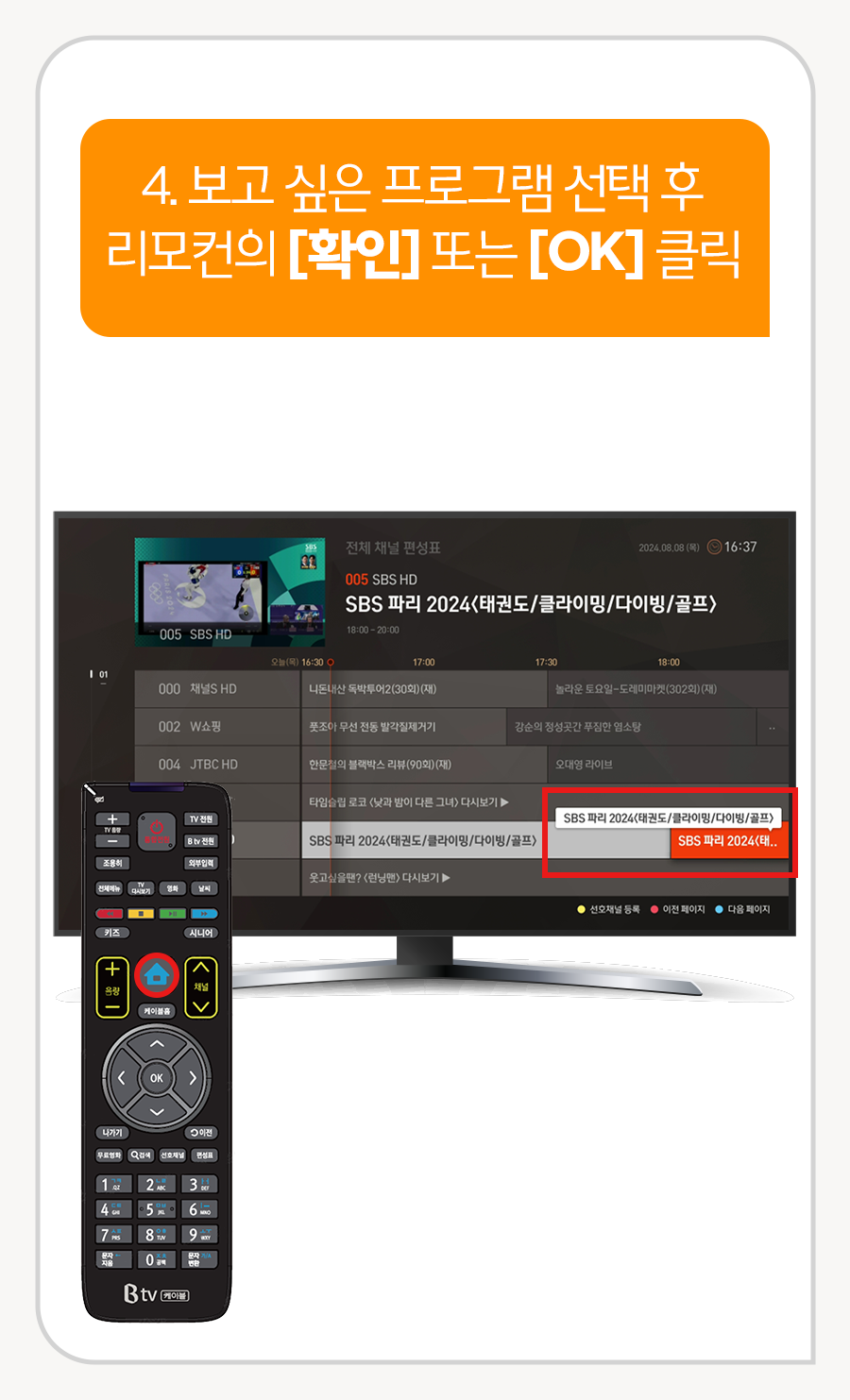 4. 보고 싶은 프로그램 선택 후 리모컨의 [확인] 또는 [OK] 클릭