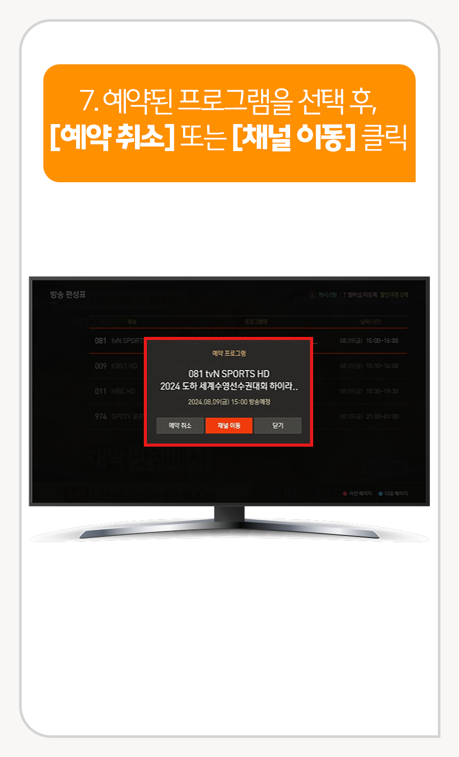 7. 예약된 프로그램 선택 후 [예약 취소] 또는 [채널 이동] 클릭