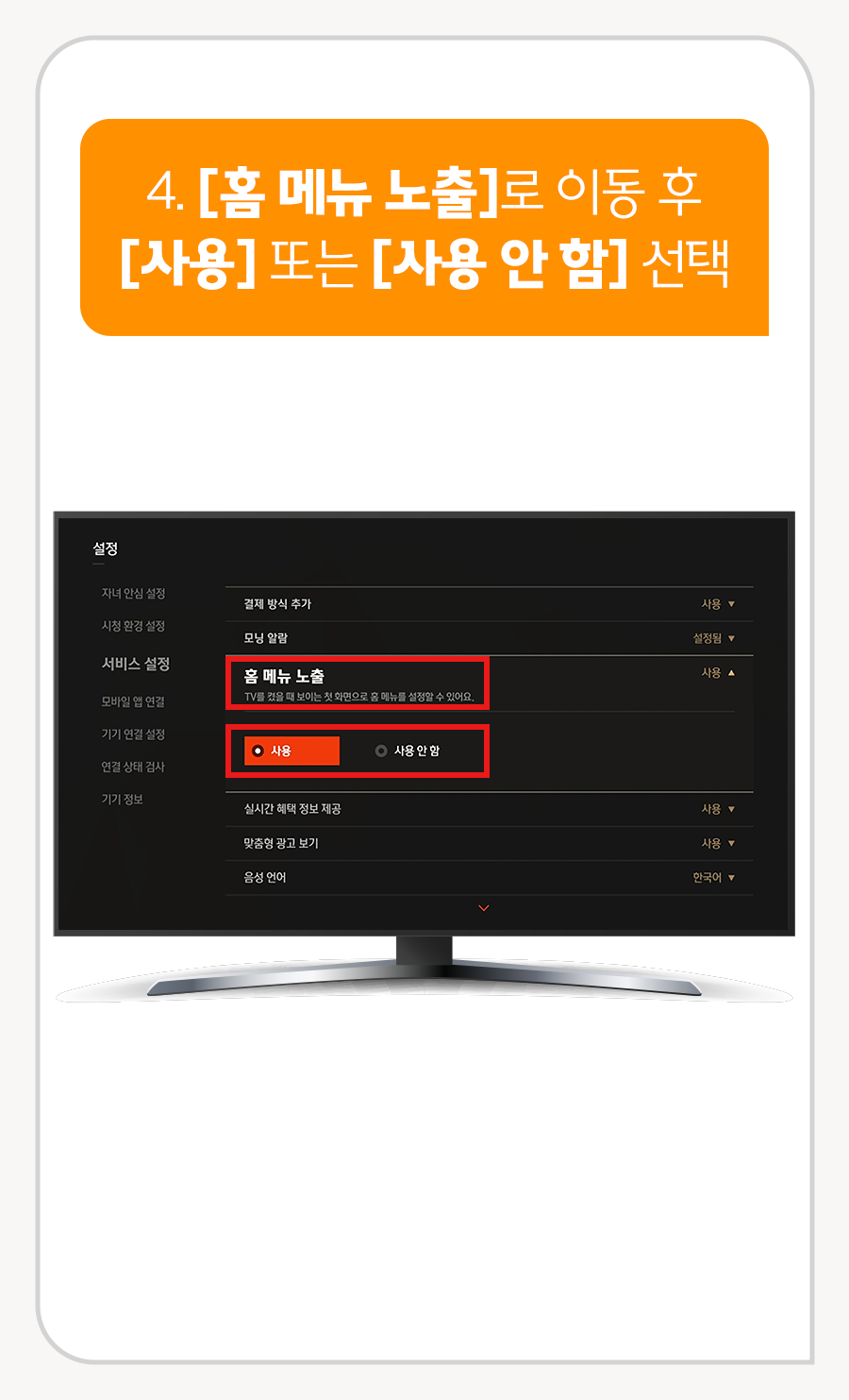4. [홈 메뉴 노출]로 이동 후 [사용] 또는 [사용 안 함] 선택
