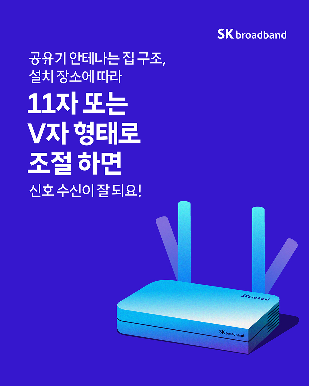 공유기 안테나는 겹치지 않도록 11자 또는 V자 모양으로 조절하면 신호 수신이 잘 됩니다!
