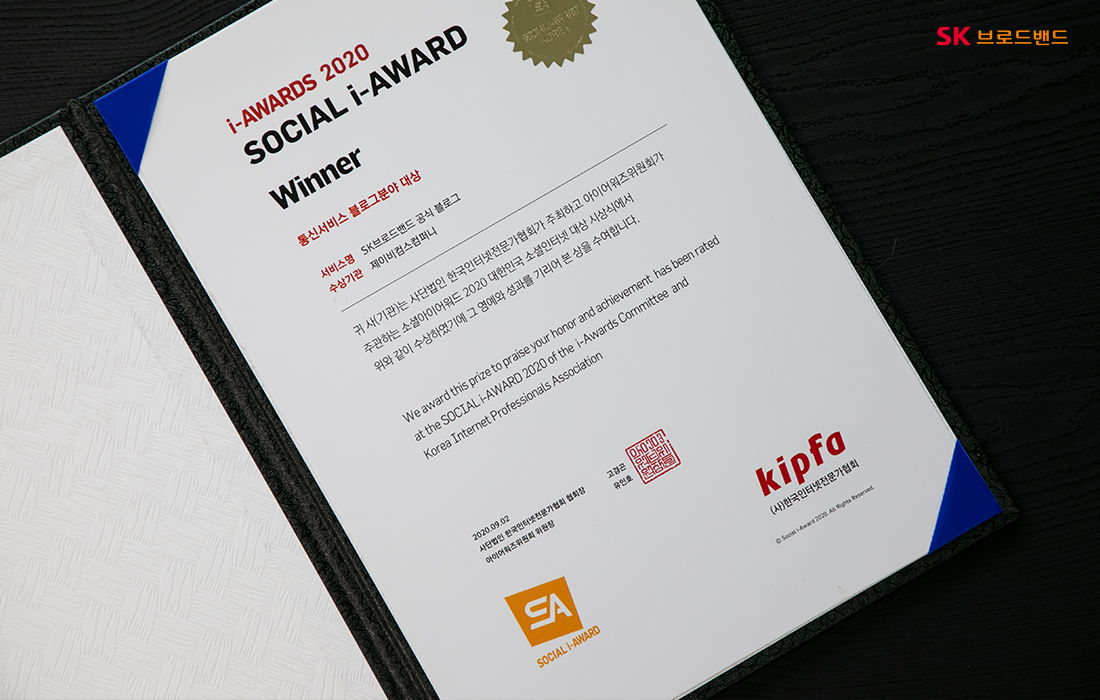 지난해, SK브로드밴드 공식 블로그는 ‘한국인플루언서산업협회’에서 주관하는 ‘2019 대한민국 블로그 어워드’에서 ‘기업부문 최우수상’을 수상한 바 있는데요.
