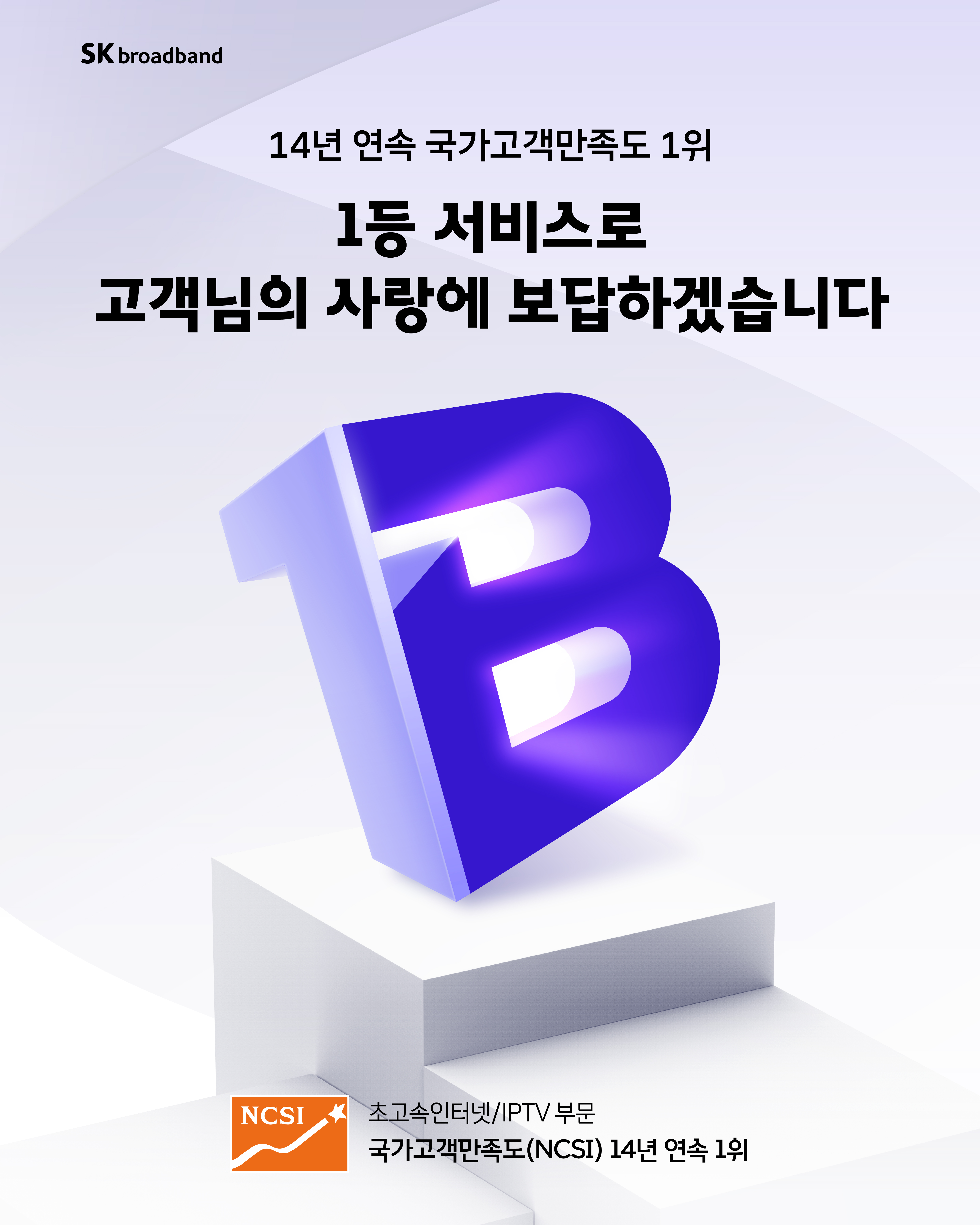 SK브로드밴드가 국가고객만족도(NCSI) 초고속인터넷/IPTV 부문 14년 연속 1위를 수상했어요!