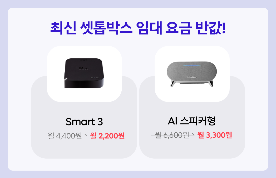 빠른 반응 속도로 AI 서비스와 고화질까지 즐길 수 있는 최신 셋톱박스를 반값으로 이용해 보세요!