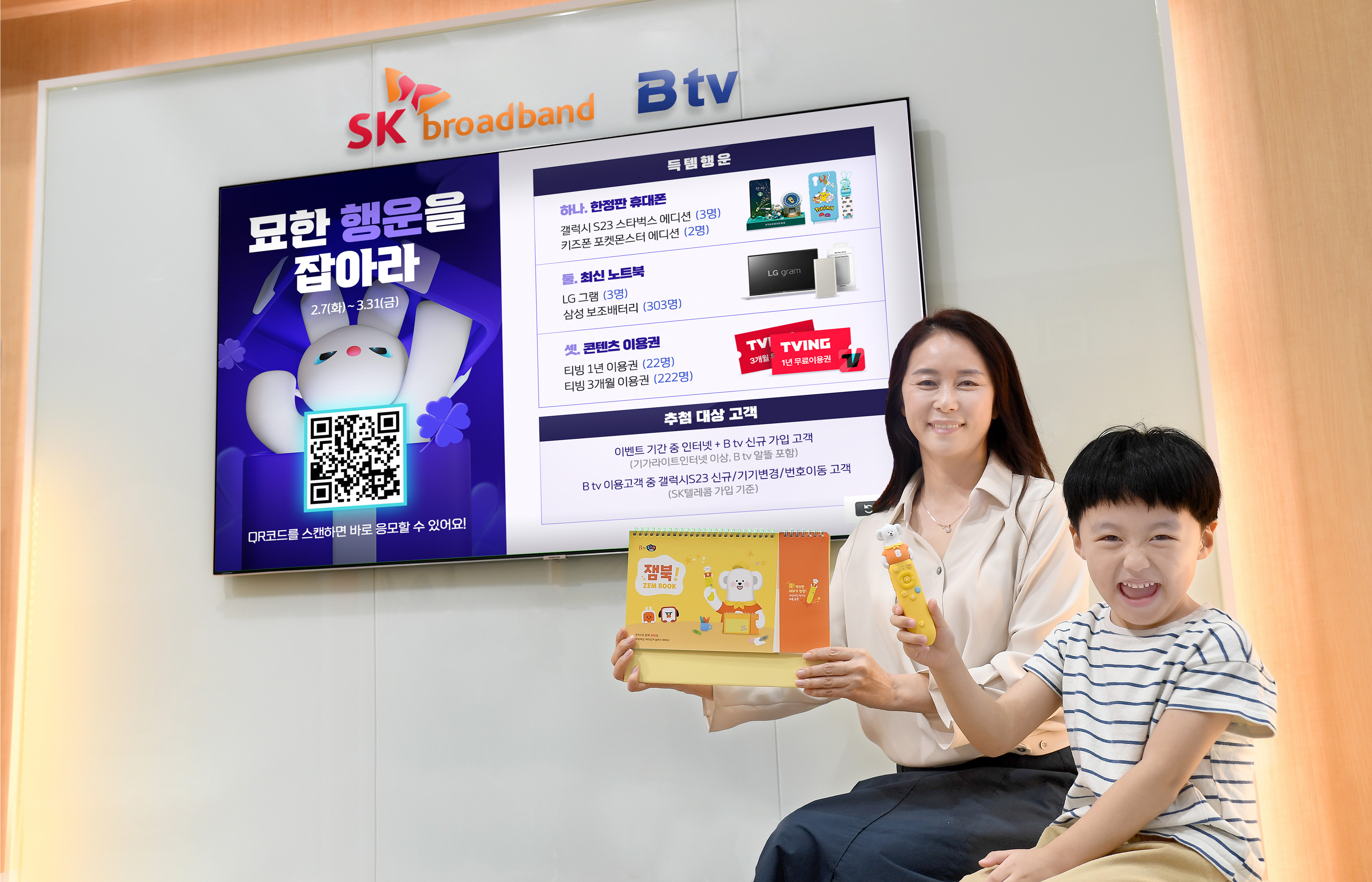 대상 고객은 SK브로드밴드 공식 홈페이지와 B tv 이벤트 페이지, B다이렉트샵, T다이렉트샵, SK텔레콤 대리점 등에서 응모할 수 있다. 해당 페이지에서 원하는 혜택 중 하나를 택하면 추첨을 통해 555명의 고객에게 노트북, 갤럭시S23 스타벅스 에디션, 키즈 전용 꾸러기폰 포켓몬 에디션, 콘텐츠 이용권, 보조배터리 등 총 4천만원 규모의 푸짐한 선물을 증정한다.