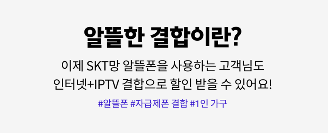 SKT망 알뜰폰 + 인터넷 + IPTV 결합으로 매달 할인을 받을 수 있어요.