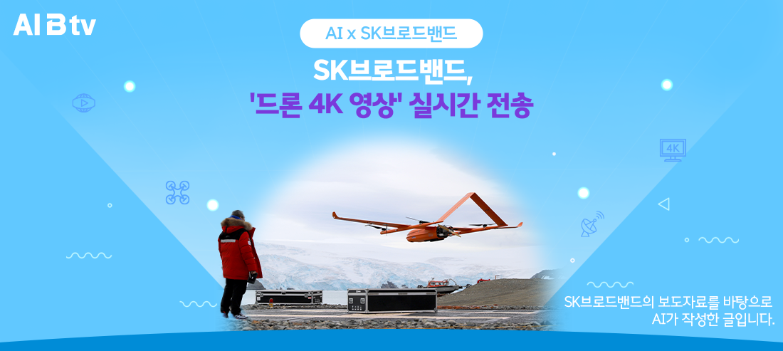SK브로드밴드는 SK텔레콤, 드론 제조업체 파인브이티와 협력하여 남극에서 드론으로 촬영한 4K 영상을 실시간으로 암호화 전송하는 실증 작업을 성공리에 마쳤어요.