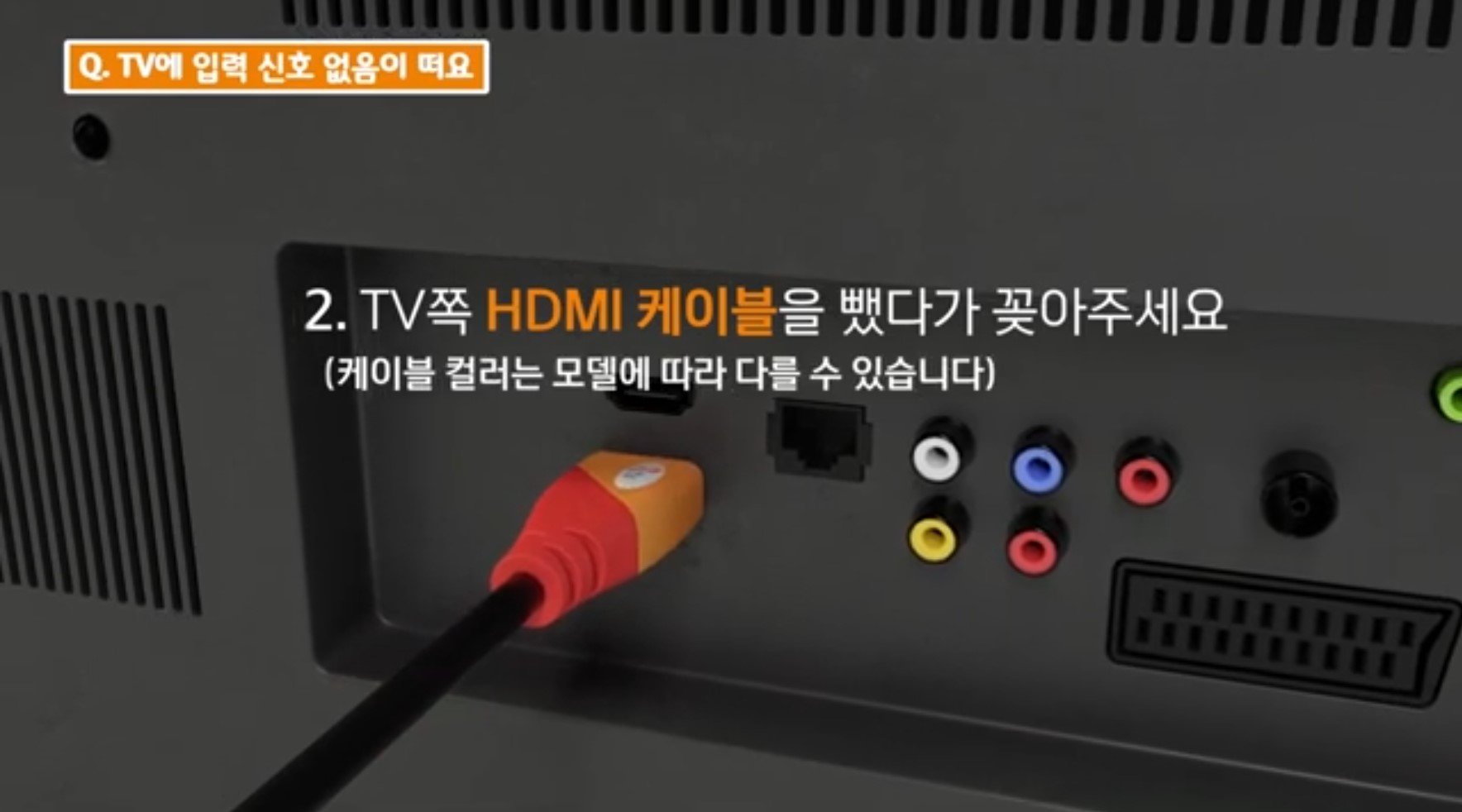 다음은 TV 뒤쪽 HDMI 케이블선을 뺐다가 다시 꽂아주세요.