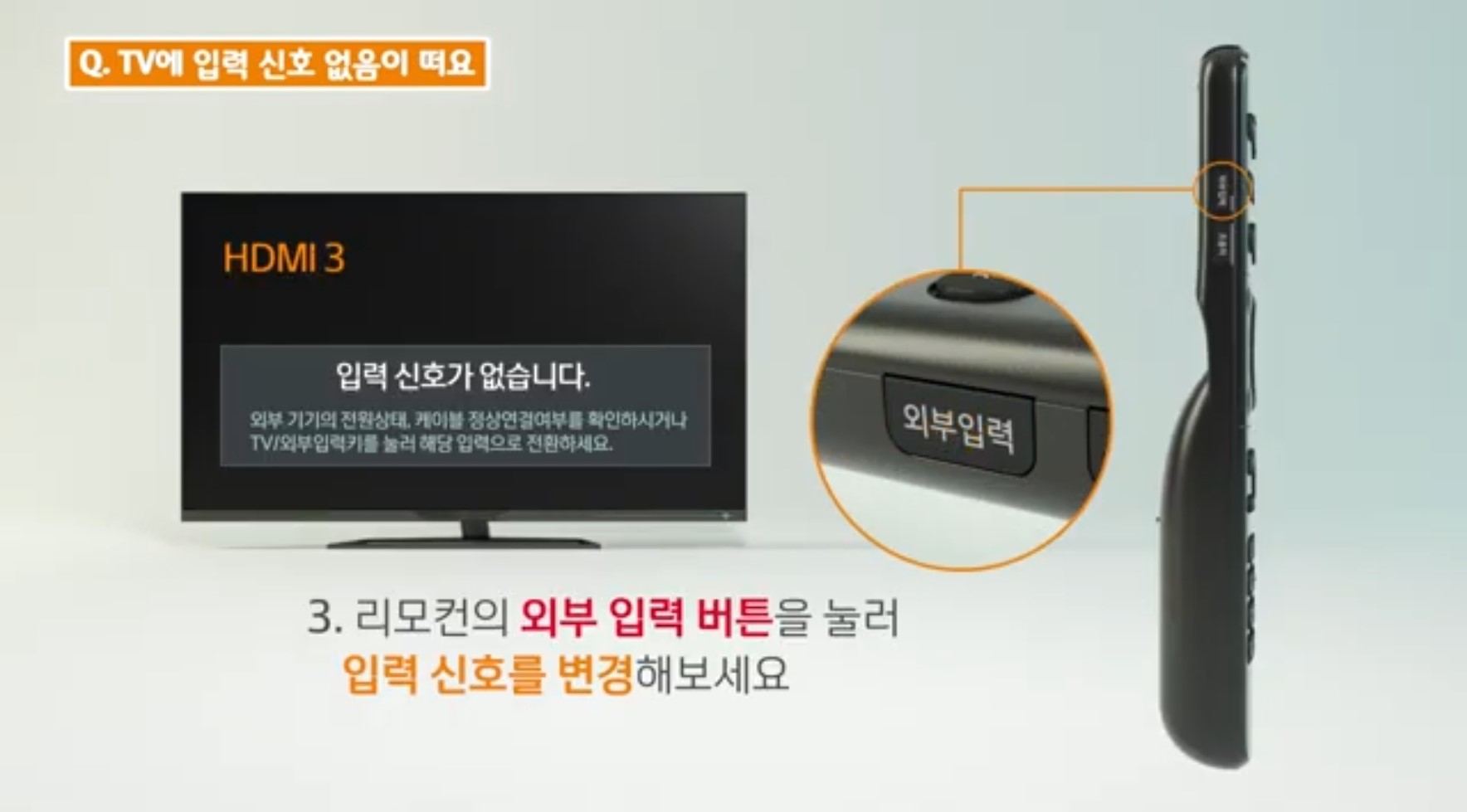그래도 해결되지 않는다면 리모컨의 외부입력 버튼을 눌러 입력신호를 변경해보세요.