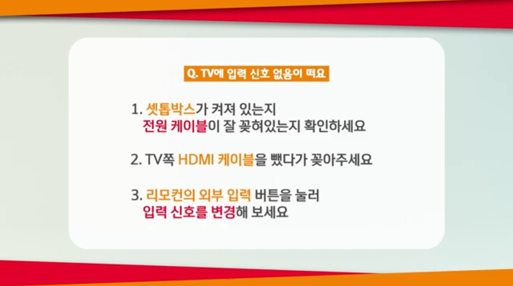 먼저 셋톱박스가 켜져있는지 전원케이블은 잘 연결되어 있는지 확인하세요.