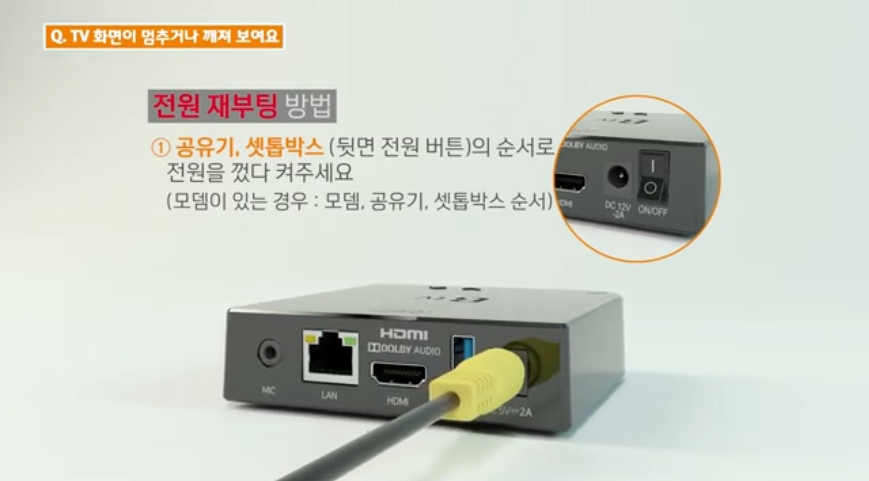 셋톱박스는 뒷면에 있는 전원 어댑터 선을 뺏다 꽂아주세요.