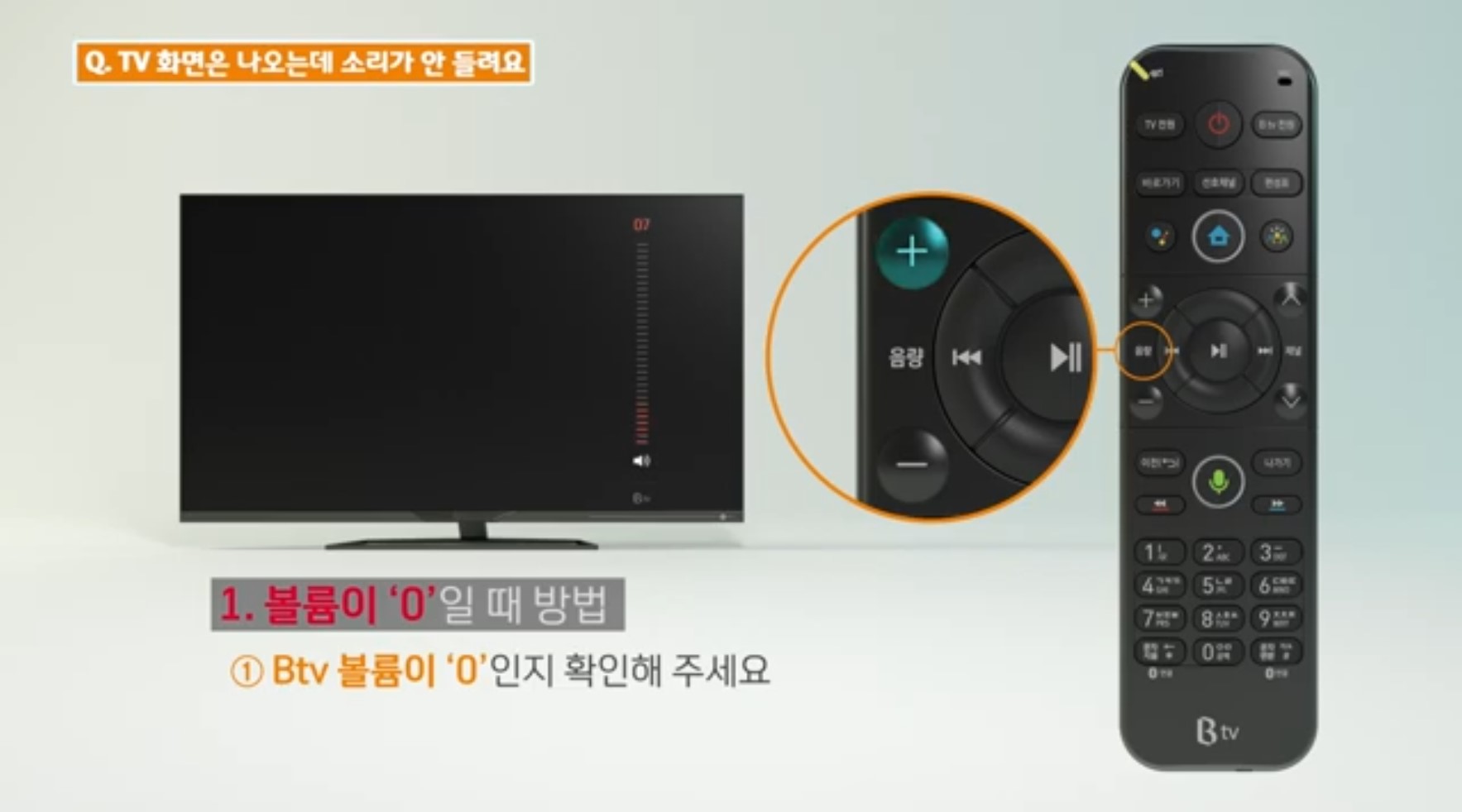 TV에서 소리가 들리지 않는다면 먼저 리모컨 상단의 'B tv 음량' 버튼을 눌러 볼륨이 '0'인지 확인 합니다.