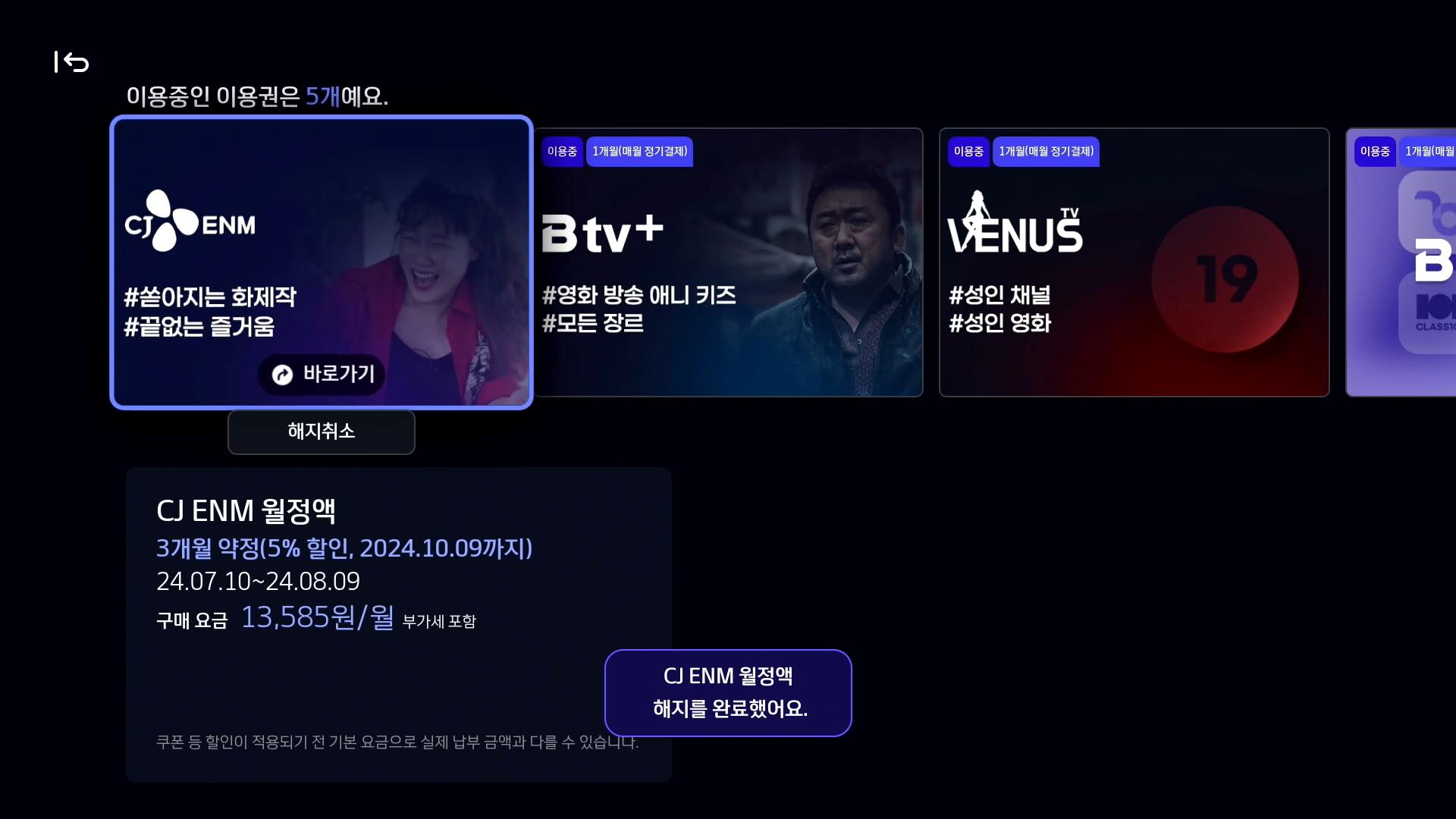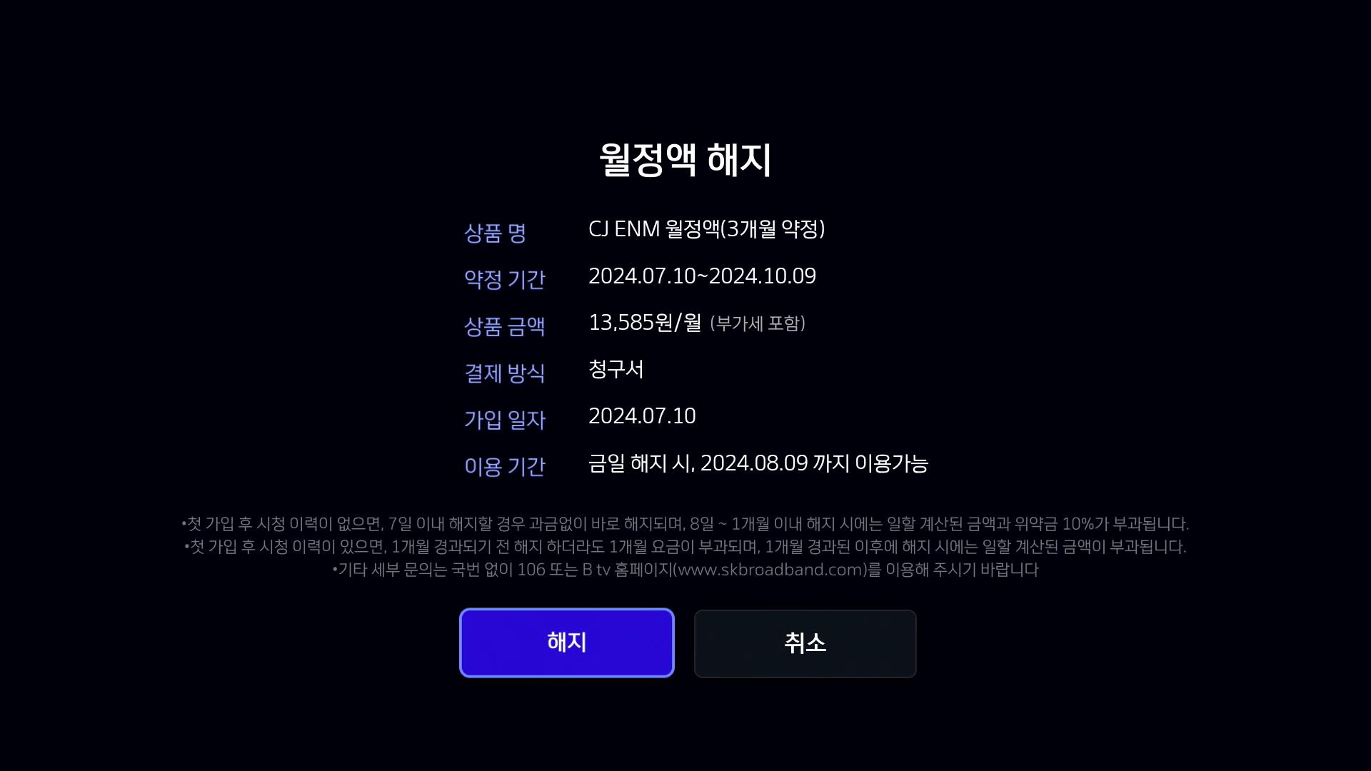 6. 월정액 해지 화면에서 '해지'를 선택합니다.