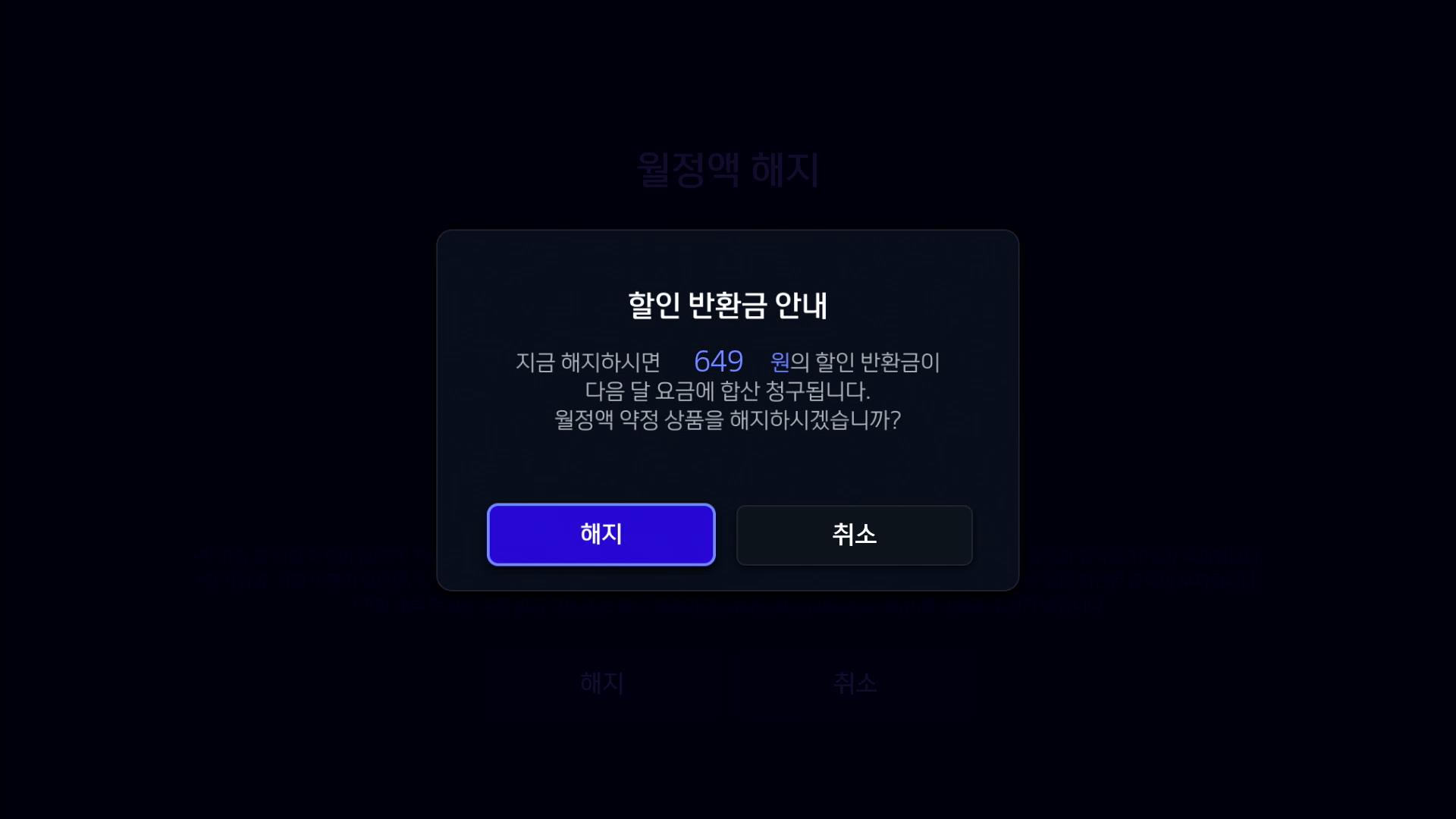 7. 약정 기간 내에 월정액을 해지하시면 발행하는 할인 반환금을 확인하시고, '해지'를 선택합니다.