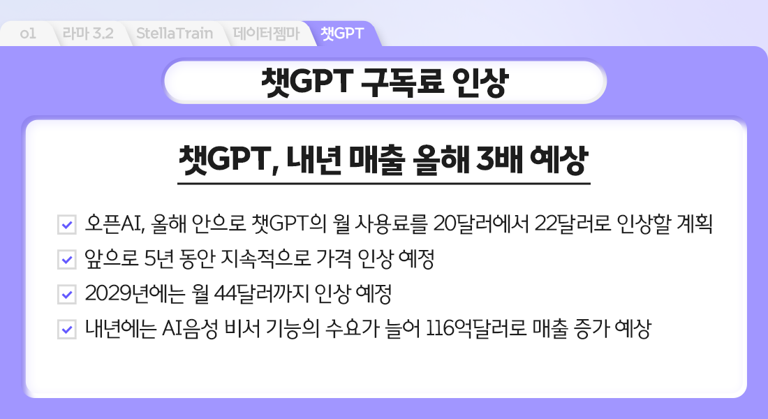 1. Summary: 오픈AI가 올해 안으로 '챗GPT'의 월 사용료를 현재 20달러에서 22달러로 인상할 계획으로 알려졌다.