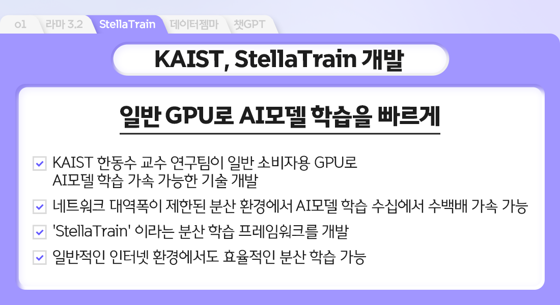 1. Summary: KAIST 한동수 교수 연구팀이 일반 소비자용 GPU를 활용해 네트워크 대역폭이 제한된 분산 환경에서 AI 모델 학습을 수십에서 수백배 가속할 수 있는 기술을 개발했다.