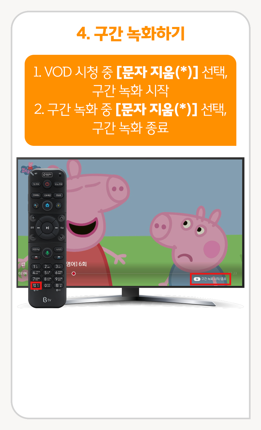 ① VOD 시청 중 [문자 지움(*)] 선택, 구간 녹화 시작