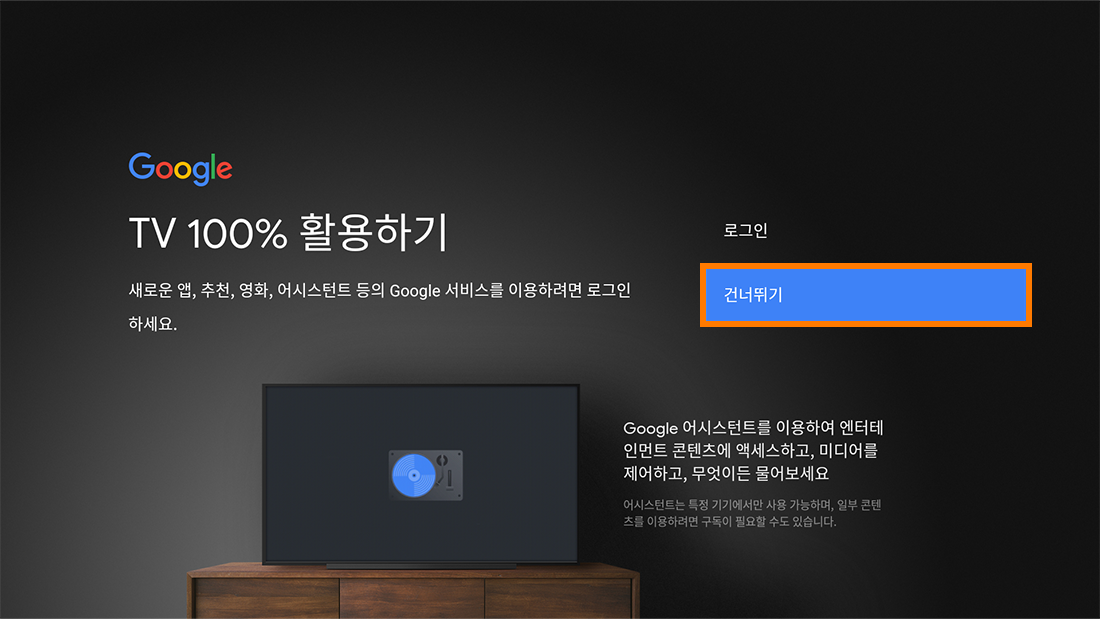 셋톱박스 업데이트 후 구글 설정 화면(총 8개)에서 계속/건너뛰기/동의/허용하셔야 최종 완료됩니다.
